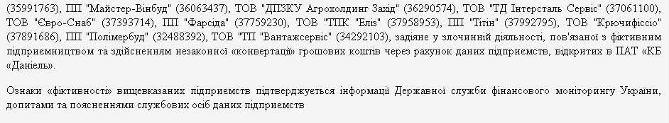 ООО "ДПЗКУ Агрохолдинг Запад", где числился директором Сергей Билан, десятки раз упоминается в судебных определениях, связанных с уголовным производством по отмыванию средств. Вот фрагмент одного их судебных решений: