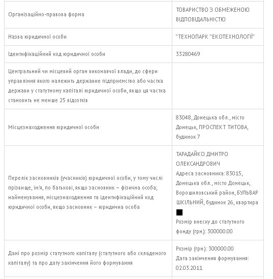 А учредителем ООО "Технопарк Экотехнологии", как видим, является Дмитрий Тарадайко. Семья Тарадайко владела крупным пакетом акций донецкого банка "Камбио". Сам Дмитрий Тарадайко входил в наблюдательный совет, а его мать Наталья Тарадайко была председателем правления банка. В конце 2014 года НБУ признал банк "Камбио" неплатежеспособным, затем начал процедуру его ликвидации.