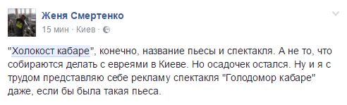 Журналист Евгений Смертенко говорит о том, что неприятный осадок все равно остался: "Холокост кабаре", конечно, название пьесы и спектакля. А не то, что собираются делать с евреями в Киеве. Но осадочек остался. Ну и я с трудом представляю себе рекламу спектакля "Голодомор кабаре" даже, если бы была такая пьеса".