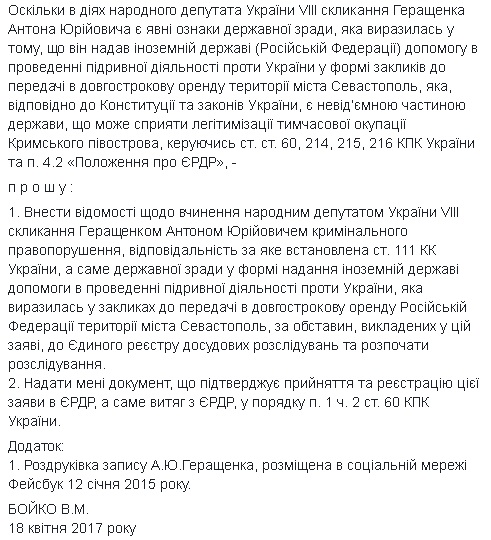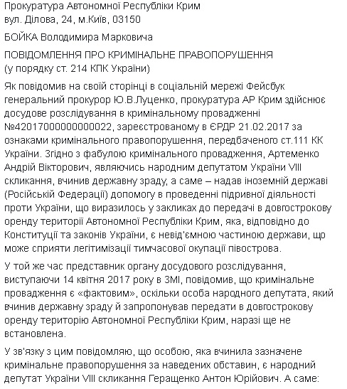 Прокуратурой Автономной Республики Крым начато уголовное производство по признакам ч.1 ст.111 УК Украины по факту совершения народным депутатом Украины Антоном Геращенко государственной измены. Об этом написал журналист Владимир Бойко на своей странице в Facebook.