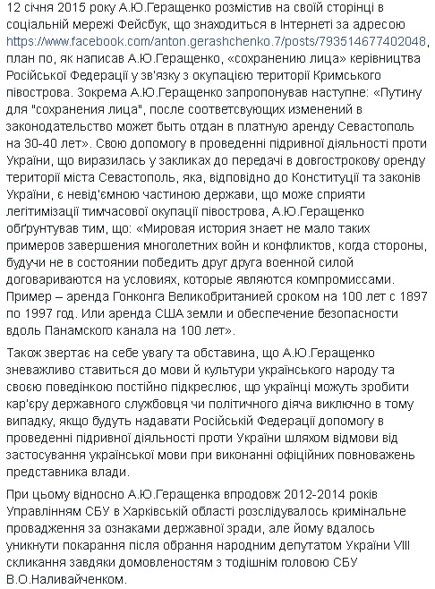 Речь идет о предложении Геращенко передать в аренду России Севастополь. Это предложение Геращенко озвучил в 2015 году на своей странице в ФБ.