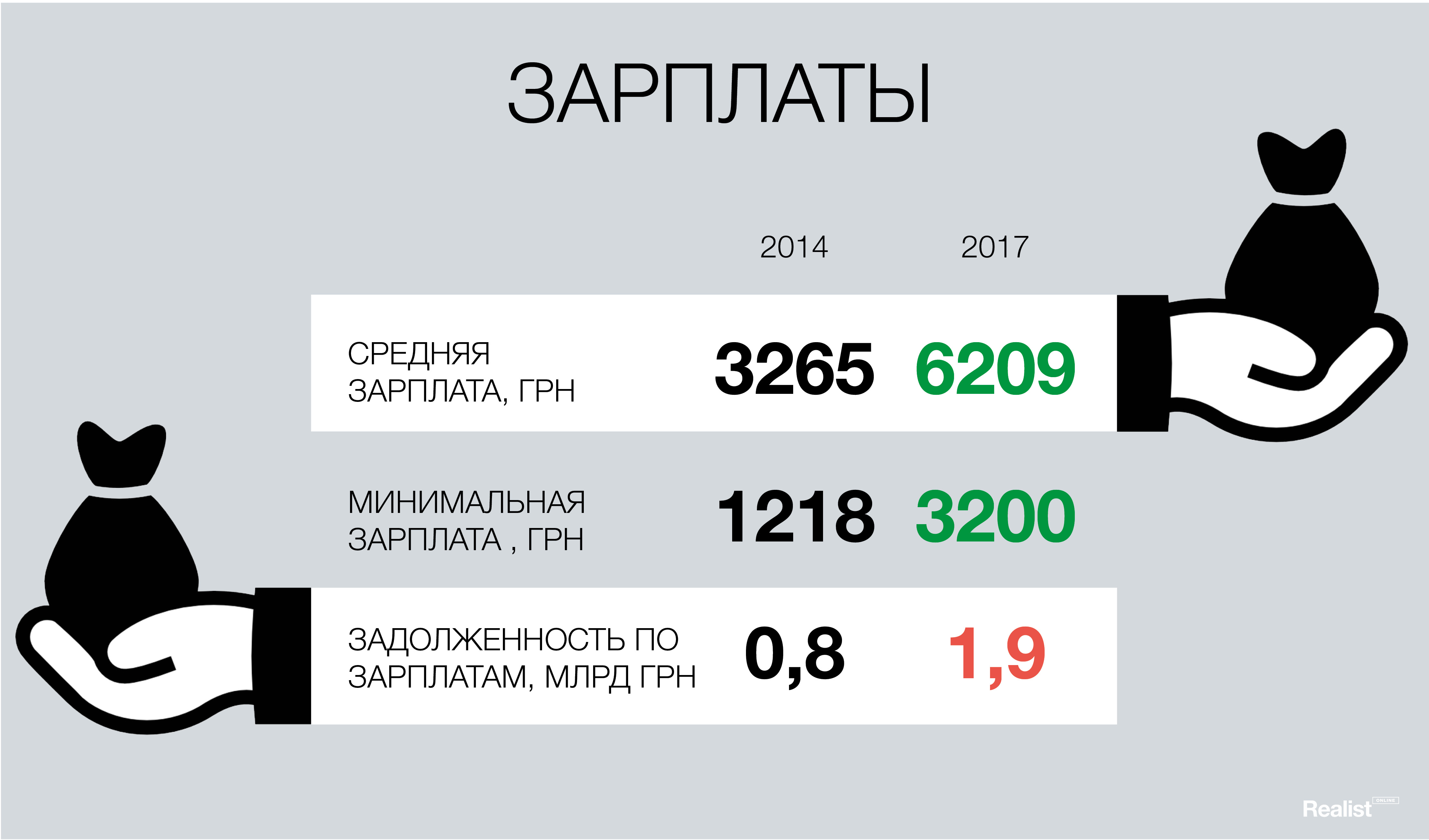 Несколько цифр для понимания. Средняя зарплата за последние три года увеличилась почти вдвое — до 6,2 тыс. грн. При нынешнем курсе гривны это около $ 231. В 2013 году средняя зарплата 3,2 тыс. грн составляла по тому же курсу $ 413.