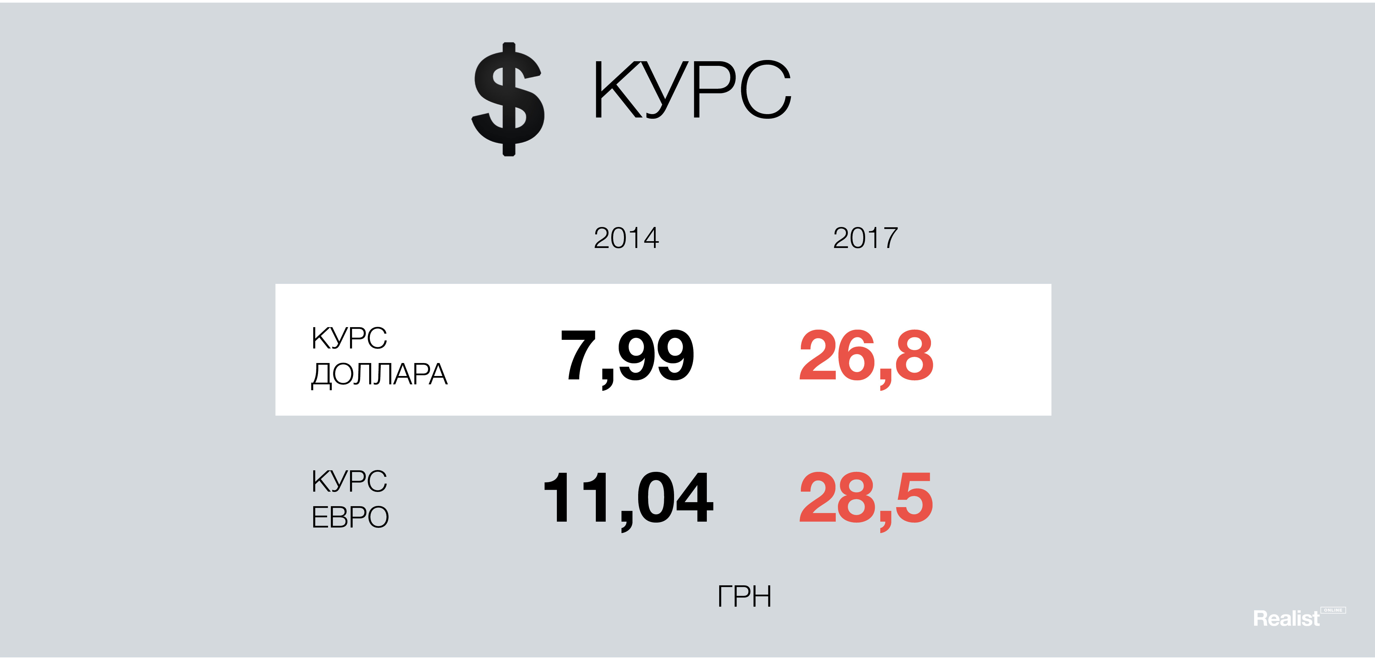 Цены росли по разным причинам. Универсальная — девальвация гривны, подстегнувшая скачки инфляции. За три года национальная валюта побила все возможные и невозможные антирекорды, опустившись с 7,99 грн/$ в начале 2014 года до 26,8 грн/$ на сегодняшний день.