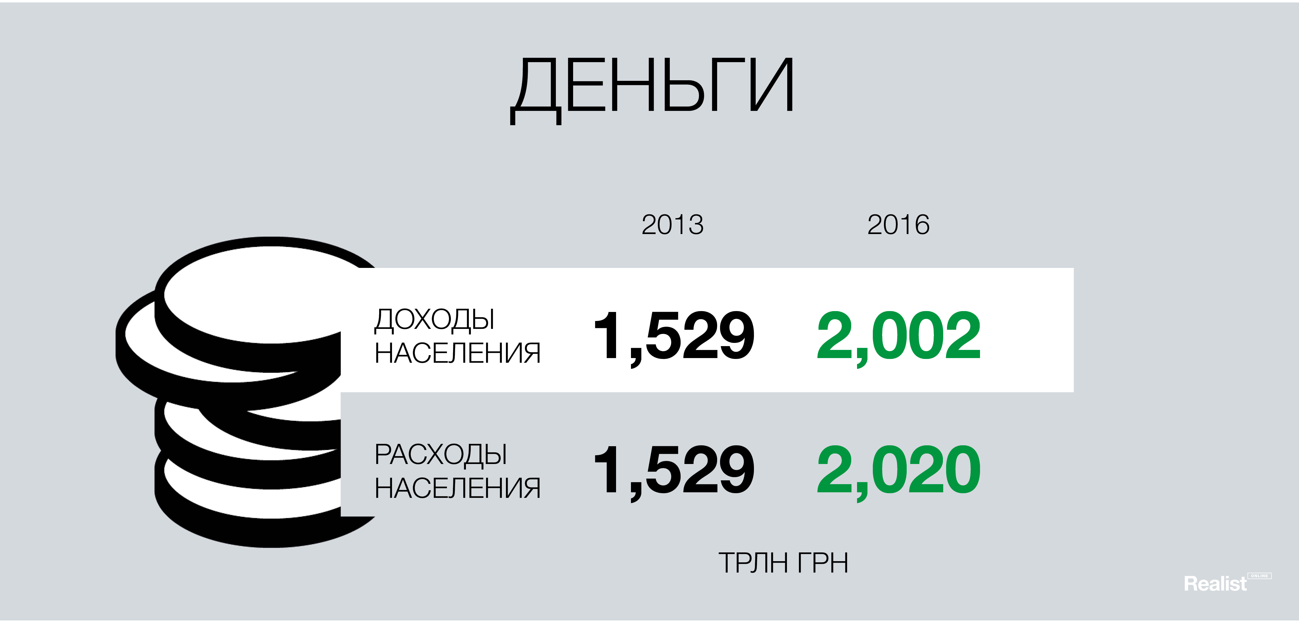 Росли номинальные доходы — росли и расходы. Если в 2013 году граждане получили общий доход свыше 1,5 трлн грн, столько же они и потратили. В прошлом году показатель по доходам уже превысил 2 трлн грн. Причем расходов в прошлом году было больше, чем доходов. По данным Госстата, в 2016 году население «проело» 18,5 млрд грн своих ранее отложенных накоплений.