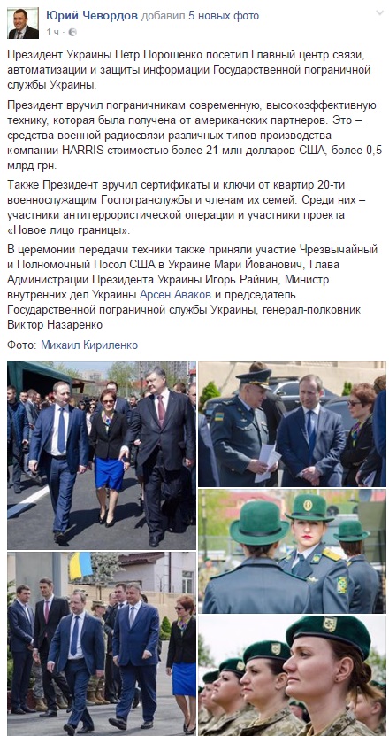 В пятницу, 28 апреля, в Главном центре связи состоялась торжественная церемония при участии президента Петра Порошенко и посла США в Украине Мари Йованович, на которой украинским пограничникам вручили современные средства связи.