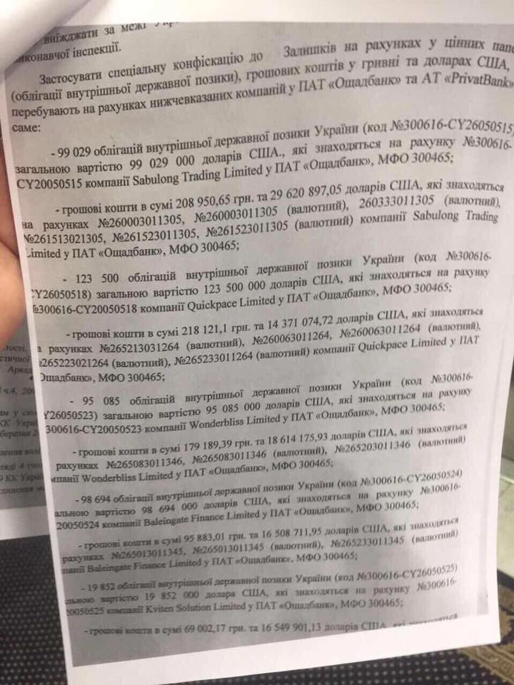 Про "1,5 миллиарда Януковича", которые уже успели стать легендарными, долгое время ходили разные слухи. Было известно, что львиная доля этих средств - это именно облигации и они заблокированы в депозитарии, а на специальном счету на них капают проценты. Интересно, что бывшая глава Минфина Наталия Яресько признавалась, что это именно государство Украина платит по ним проценты и даже гасит основной долг. Власть неоднократно и безуспешно пыталась их изъять, сперва предлагалось ради этого принять закон о спецконфискации, затем изъятие прописали в госбюджете, но с интересной оговоркой, на которую следует обратить особое внимание - что конфискованные облигации внутреннего государственного займа будут в полном объеме направлены на снижение суммы государственного долга с одновременным погашением обязательств по этим облигациям. И только судьбой оставшихся средств мог распоряжаться Кабмин.