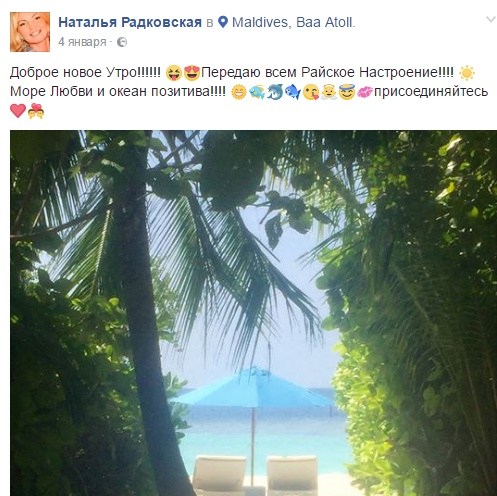 В социальных сетях Наталья публикует фотографии с дорогими ювелирными украшениями и отчеты заграничных поездок. На своей страничке Facebook светская львица ставит геотеги у берегов Гибралтара и публикует видео с испанского побережья со своей подругой – российской певицей и актрисой Эвелиной Бледанс. В декларации Радковского за прошедший год он не указал заграничные вояжи своей супруги. К слову, Новый год чета встретила на Мальдивах – о чем тоже забыла упомянуть в декларации.