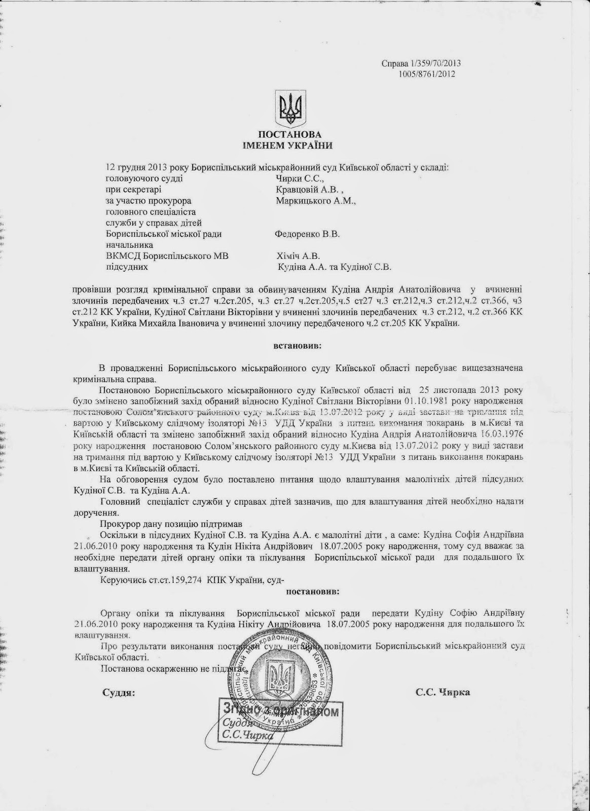 «Заседание» закончилось в полном соответствии с душевным состоянием судьи – Чирка постановил отправить обоих Кудиных в Киевский следственный изолятор №13, а их малолетних детей – в органы опеки!