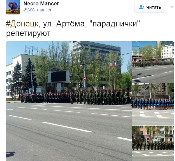 В террористическом "военном ведомстве" донецких оккупантов заявили, что основную репетицию "парада" проведут 3 мая в центре оккупированного Донецка, правда пройдет она без военной техники. "В репетиции будет задействовано более тысячи человек, всего 14 расчетных коробок, в каждой из которых 72 человека", - похвастались боевики. Благодаря пользователю Necro Mancer, в Сети были опубликованы некоторые кадры с "парада" боевиков, которые вызвали язвительные и жесткие комментарии среди его подписчиков.