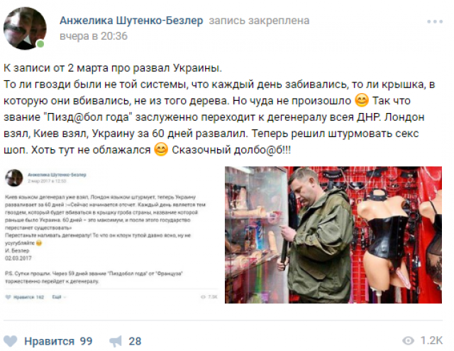 Так, Безлер написал: «К записи от 2 марта про развал Украины. То ли гвозди были не той системы, что каждый день забивались, то ли крышка, в которую они вбивались, не из того дерева. Но чуда не произошло  dqxikeidqxiqqeant Так что звание „Пизд.бол года“ заслуженно переходит к дегенералу всея ДНР. Лондон взял, Киев взял, Украину за 60 дней развалил. Теперь решил штурмовать секс шоп. Хоть тут не облажался  Сказочный долбо. б!!!».