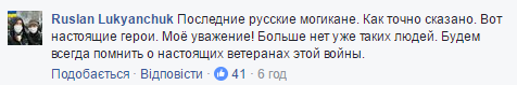 "Последние русские могикане. Как точно сказано. Вот настоящие герои. Моё уважение! Больше нет уже таких людей. Будем всегда помнить о настоящих ветеранах этой войны", - подчеркнул Ruslan Lukyanchuk.