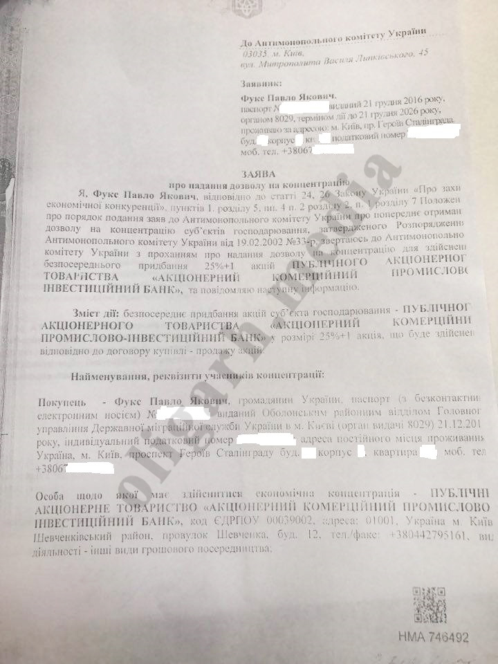 Об интересе Павла Фукса к Проминвестбанку стало известно еще несколько недель назад. Но повод переквалифицировать эту информацию из слуха в факт появился только сейчас: в распоряжении «ОЛИГАРХА» оказалось официальное обращение бизнесмена в Антимонопольный комитет Украины, в котором он просит одобрить покупку им акций этого финучреждения. «Обращаюсь в АМКУ с просьбой о предоставлении разрешения на концентрацию для осуществления непосредственного приобретения 25%+1 акция ПАО «Акционерный коммерческий промышленно-инвестиционный банк» — говорится в указанном документе. В нем также приводятся данные о том, что Фукс является гражданином Украины, а его паспорт датирован 21 декабря 2016 г. Местом своего постоянного проживания в Украине Фукс указал многоквартирный дом на Оболони (проспекте Героев Сталинграда) в Киеве.