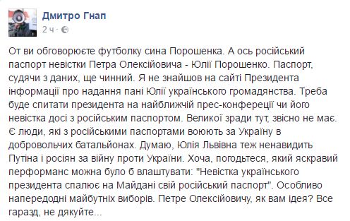 Журналист Дмитрий Гнап подчеркивает, что невестка Порошенко – гражданка России: "Вот вы обсуждаете футболку сына Порошенко. А вот российский паспорт невестки Петра Алексеевича - Юлии Порошенко. Паспорт, судя по данным, еще действующий. Я не нашел на сайте Президента информации о предоставлении госпоже Юлии украинского гражданства. Надо будет спросить президента на ближайшей пресс-конфереции, до сих пор ли его невестка с российским паспортом. Большой "зрады" здесь, конечно нет. Есть люди, которые с российскими паспортами воюют за Украину в добровольческих батальонах. Думаю, Юлия Львовна тоже ненавидит Путина и русских за войну против Украины. Хотя, согласитесь, который яркий перформанс можно было бы устроить: "Невестка украинского президента сжигает на Майдане свой российский паспорт". Особенно в преддверии предстоящих выборов. Петр Алексеевич, как вам идея? Все в порядке, не благодарите".