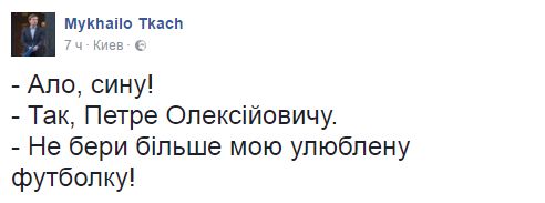 Журналист Михаил Ткач шутит: " - Алло, сынок! - Да, Петр Алексеевич. - Не бери больше мою любимую футболку!"