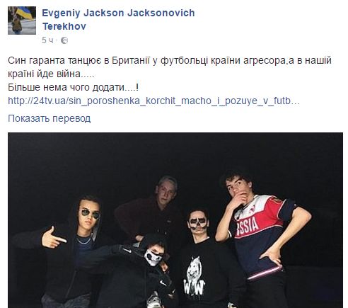 Евгений Терехов возмущается: "Сын гаранта танцует в Британии в футболке страны-агрессора, а в нашей стране идет война… Больше нечего добавить!"