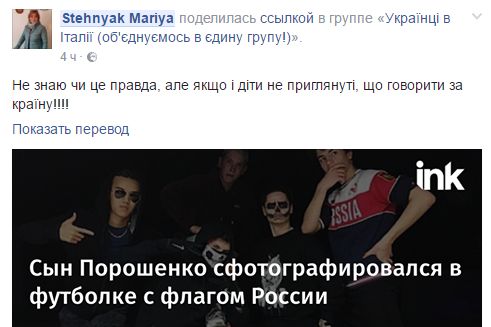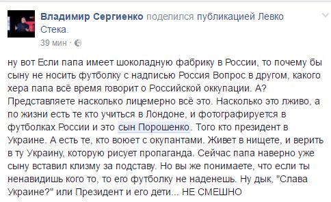 Владимир Сергиенко упрекнул семейство президента в лицемерии: "Если папа имеет шоколадную фабрику в России, то почему бы сыну не носить футболку с надписью Россия Вопрос в другом, какого хера папа всё время говорит о Российской оккупации. А? Представляете насколько лицемерно всё это. Насколько это лживо, а по жизни есть те кто учиться в Лондоне, и фотографируется в футболках России и это сын Порошенко. Того кто президент в Украине. А есть те, кто воюет с окупантами. Живет в нищете, и верить в ту Украину, которую рисует пропаганда. Сейчас папа наверно уже сыну вставил клизму за подставу. Но вы же понимаете, что если ты ненавидишь кого то, то его футболку не наденешь. Ну дык, "Слава Украине?" или Президент и его дети... НЕ СМЕШНО".