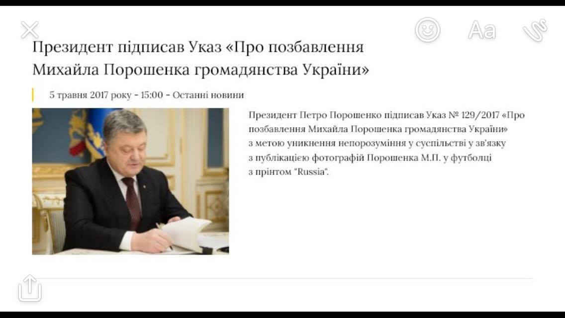 Также по сети начала гулять картинка с "новостью" о том, что якобы президент "подписал указ о лишении Михаила Порошенко гражданства Украины".