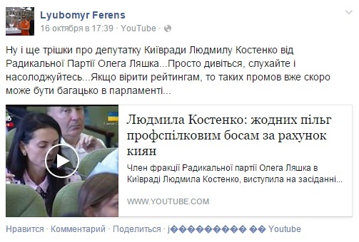 "Радикальная жизнь — она тяжелая и богатая! Без вил и коров. Людмила Васильевна Костенко — депутат Киевсовета от Радикальной Партии Олега Ляшко (секретарь постоянной комиссии по вопросам семьи, молодежи и спорта)", — написал Ференс.