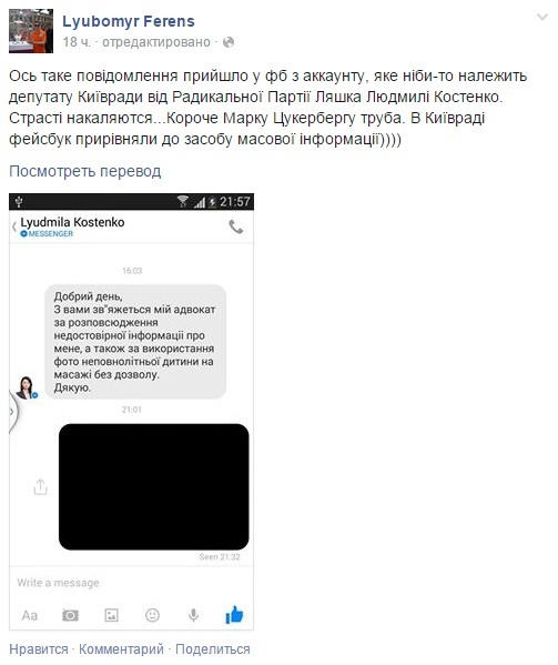 Журналист Любомир Ференс в своем Facebook опубликовал фотографии депутата Киевсовета от партии Олега Ляшко Людмилы Костенко из её "тайного" аккаунта в Facebook.