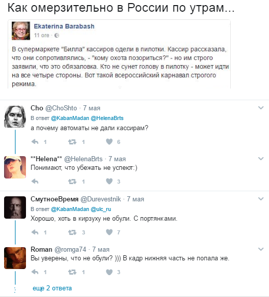 "Кассир рассказала, что они сопротивлялись, - "кому охота позориться?" - но им строго заявили, что это обязаловка. Кто не сунет голову в пилотку - может идти на все четыре стороны. Вот такой всероссийский карнавал строгого режима", - подписала женщина.