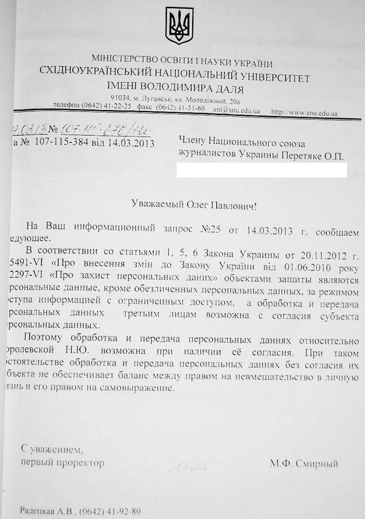 Заинтересовавшись этими вопросами, мы обратились к администрации луганского ВУЗа с журналистским запросом и просьбой ознакомиться с личным делом студентки – нынешним министром. 19.03.2013 г. первый проректор университета М.Ф. Смирный ответил отказом в информации журналисту, сославшись на то, что «обработка и передача персональных данных относительно Королевской Н.Ю. возможна лишь при ее согласии».