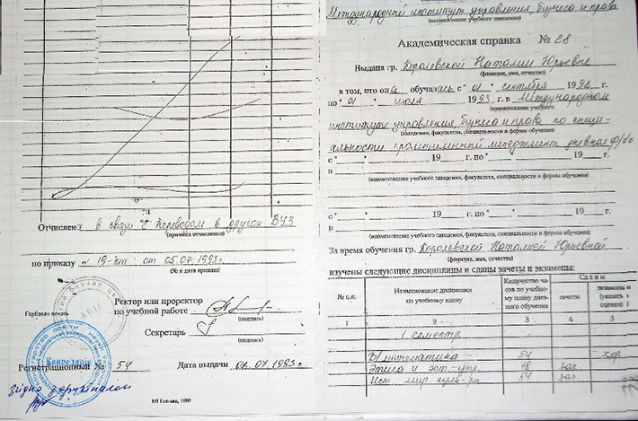 У следователя в деле подшита академическая справка №28, «выданная гр. Королевской Наталии Юрьевне в том, что она обучалась с 01 сентября 1992 г. по 01 июля 1993 г. в Международном институте управления, бизнеса и права по специальности промышленный менеджмент дневная ф/о». В справке на месте гербовой печати почему-то стояла печать с аббревиатурой «АБЦ» - Алчевский бизнес-центр.