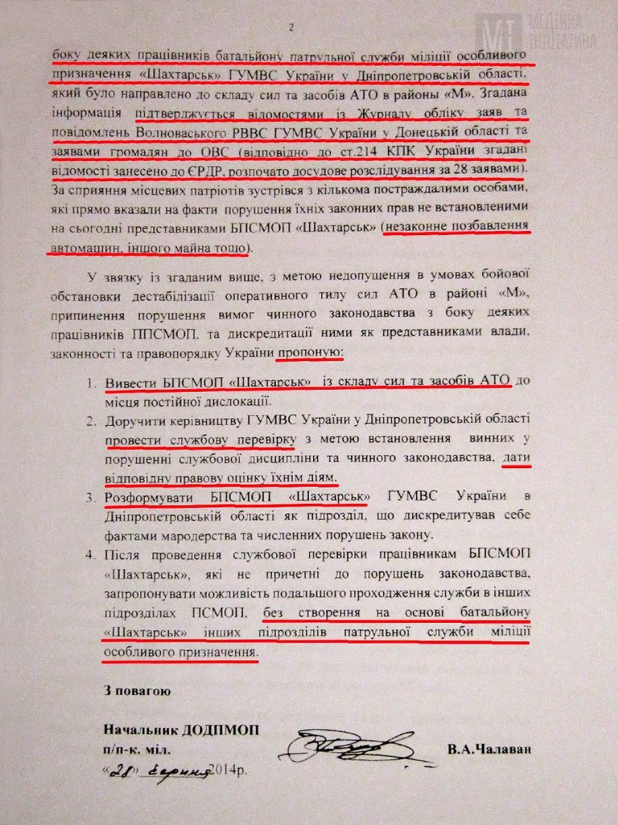«Отчитываясь о своей командировке в Донецкой области, кроме прочего, Чалаван сообщает министру о выявленных им фактах нарушений прав местных жителей со стороны неустановленных на тот момент представителей “Шахтерска”. В документе Чалован отмечает: «после проведения служебной проверки работникам БПСМОН «Шахтерск», которые не причастны к нарушениям законодательства, предложить возможность прохождения службы в других подразделениях БЕЗ СОЗДАНИЯ НА ОСНОВЕ БАТАЛЬОНА «ШАХТЕРСК» ДРУГИХ ПОДРАЗДЕЛЕНИЙ патрульной службы милиции особого назначения» – ссылаются на документ активисты.