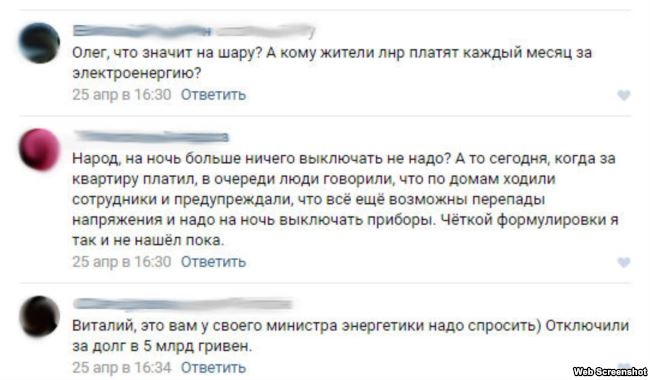 На протяжении трех лет существования группировки «ЛНР» Украина продолжала подавать электроэнергию в Луганск с тепловой электрической станции в городе Счастье. И только в ночь на 25 апреля 2017 года временно неподконтрольную территорию оставили без украинского света. Как объяснила украинская сторона – за долги. А их накопилось уже на 5 миллиардов гривен. Интересно, что на неподконтрольной территории жители неоднократно платили и по украинским ценам, и по ценам группировки «ЛНР», но деньги, видимо, так и не дошли до предприятия, подающего электроенергию.