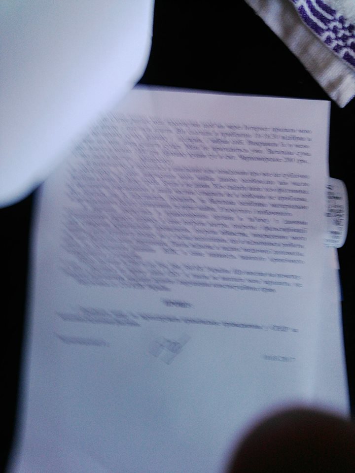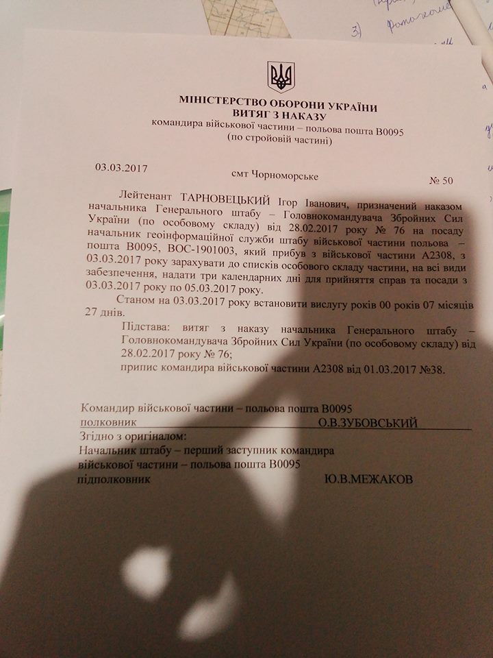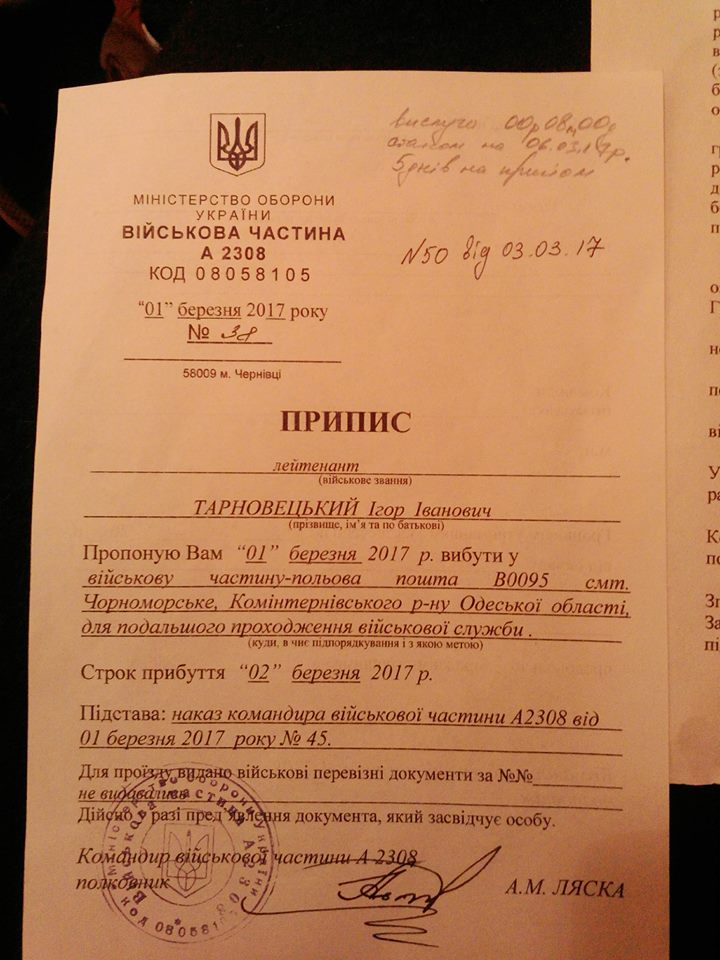 «Я, лейтенант Тарновецкий И. в части ВВ0095 Черноморское (Чабанка), Одесская область. Меня пытаются заставить принять пост с материальной ответственностью и недостачей, я отказываюсь. Звучат угрозы в мою сторону. Я на себя записывать недостатка не буду. В части недостачи на 67 млн. (И это когда волонтеры собирают по несколько гривен тем временем командование частей ворует миллионами). Меня сюда на ссылку отправил полковник Ляско Анатолий Николаевич. Джип задекларировал? А командование? Приписали мне имущество которое я не получал. Кроме того у меня проблемы с здоровьем и в госпиталь не разрешают идти. Вот такая демократия. И до сих пор не оплатили зарплату при увольнении из части А 2308. Отправили без средств и билетов в Одессу. Спасибо им», — пишет он публикуя фотографии документов: