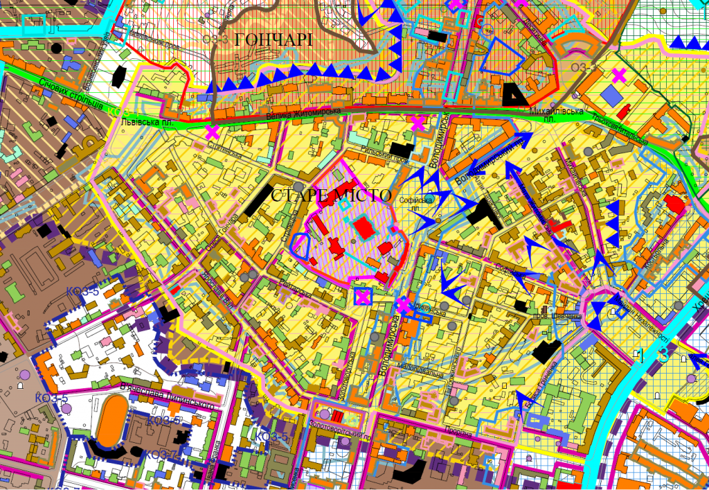 Фрагмент нового Историко-архитектурного опорного плана г. Киева, на котором черным цветом выделены диссонирующие новые здания в буферной зоне «Софии Киевской». Рядом с буквой С (СТАРЕ МІСТО) находится объект на ул. Гончара, 17-23. Видны огромные в плане размеры здания.