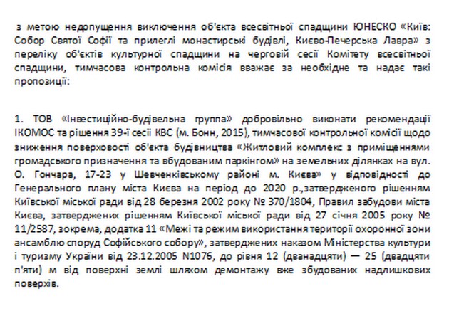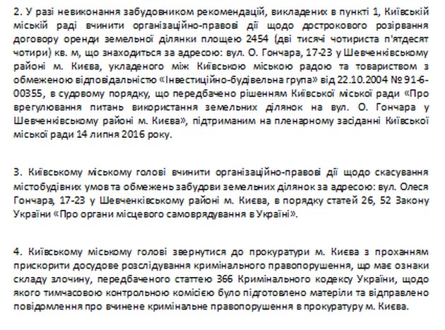 «1. Оголосити негайний мораторій на будівництво по вул.. Гончара 17-23. Будь-які будівельні роботи слід негайно припинити.