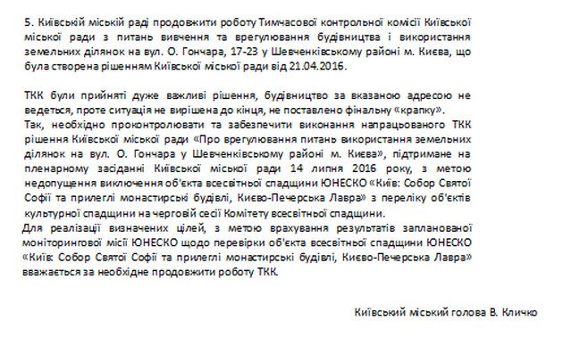 5. Збереження і розвиток історико-культурного потенціалу м. Києва повинні бути визнані єдиною і пріоритетною метою розвитку міста і коригування його Генерального плану».