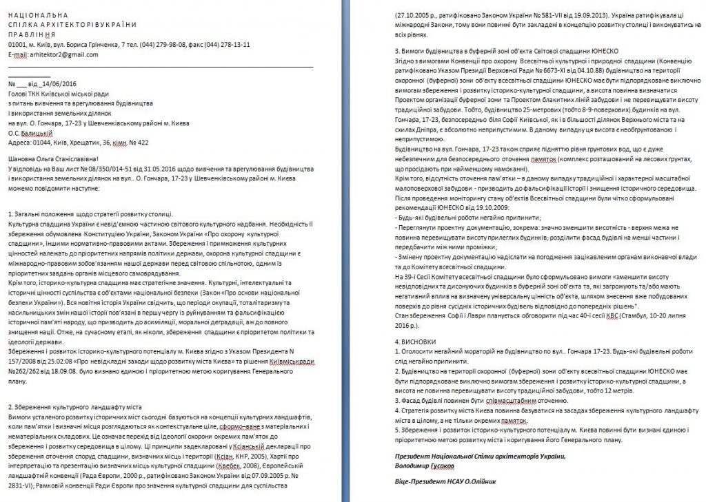 Еще год назад свой профессиональный взгляд на строительство монстра на ул. Гончара, 17-23 высказал Национальный союз архитекторов Украины. Запрос поступил от депутата Киевсовета О.Балицкой. Главные выводы: