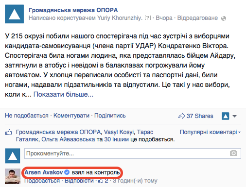 Представники Громадянської мережі ОПОРА написали заяву до міліції, надали фото- і відеодокази, які відновили, номерний знак мікроавтобуса. Цікаво, що один із нападників (той, хто почав бити першим) представився бійцем батальйону «Айдар». Майже на кожній зустрічі з виборцями або заході, який організовує кандидат Віктор Кондратенко, його супроводжують айдарівці. Яка їхня функція на заходах - невідомо.