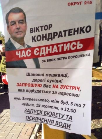 У неділю, 19 жовтня, о 12:15, під час відкриття бювету кандидатом-самовисуванцем по 215 округу Віктором Кондратенком сталася конфліктна ситуація між представниками кандидата і 3-ма молодиками з ВО «Свобода» (Василь Харченко, Віктор Сумарєв, Дмитро Макаров), які розповсюджували агітаційні листівки.