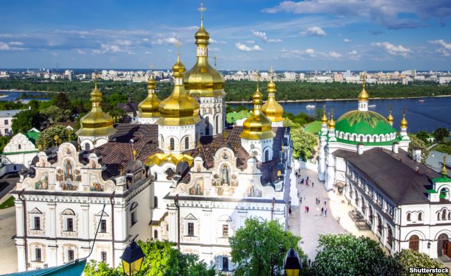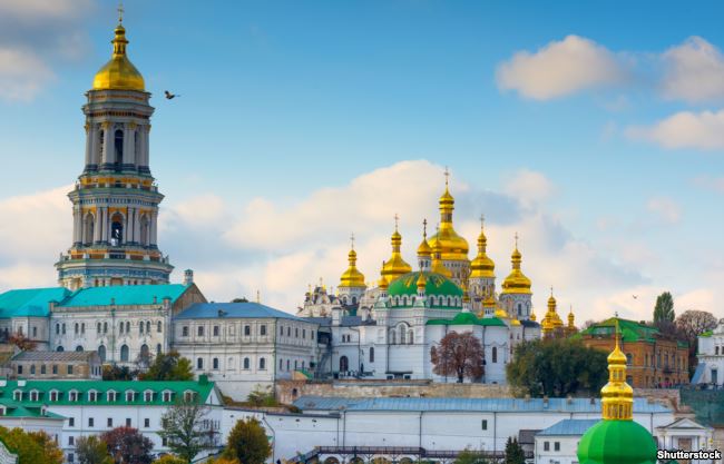 Вид на Киево-Печерскую лавру со стороны «Мемориала жертв Голодомора» (слева), посвященный погибшим во время геноцида в Украине в 1932-33 годах, осуществленного тогдашним коммунистическим режимом СССР