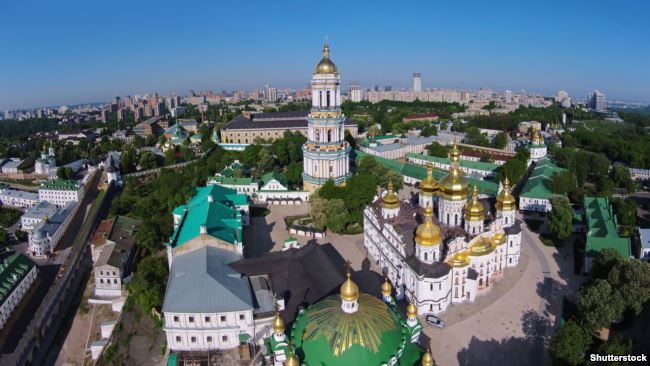 Вигляд на Києво-Печерську лавру з боку «Меморіалу жертв Голодомору» (ліворуч), що присвячений загиблим під час геноциду в Україні в 1932-33 роках, здійсненого тодішнім комуністичним режимом СРСР dqxikeidqxiqqeant