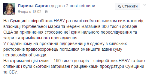 Согласно версии пресс-секретаря генпрокурора, Самковой вместе с сообщником на Сумщине вымогали у владелицы одной из торговых марок и сети магазинов 300 тысяч долларов "за прекращение уголовного преследования в ее отношении и закрытие уголовного производства". При этом, в ходе переговоров в столичном ресторане, бизнес-вумен с Самковым, ей якобы удалось вдвое "сбить" размер взятки. С этими 150 тысячами долларов "сотрудник НАБУ" и его подельник и были задержаны 19 мая.