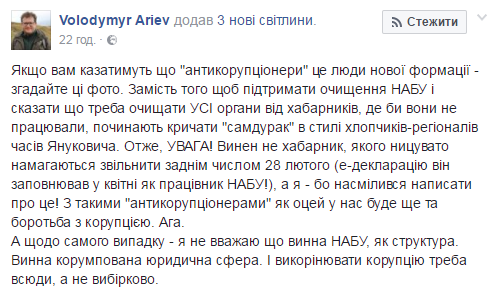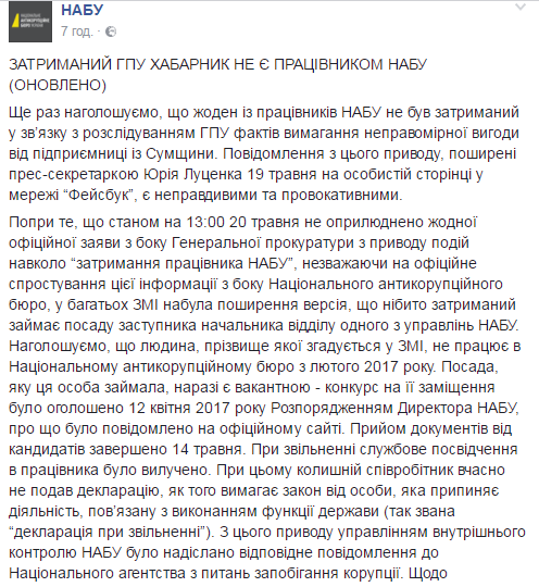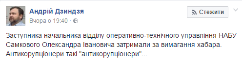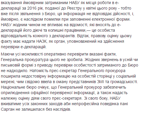 В самом НАБУ как устами пресс-секретаря Бюро Светланы Олифиры, так и на официальной Facebook-странице ведомства второй день настаивают: Самковой с 28 февраля 2017 года был уволен, и на данный момент не является их сотрудником.