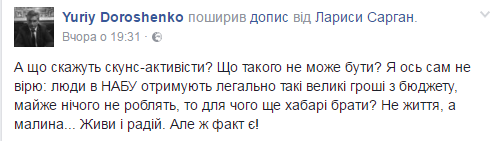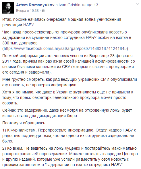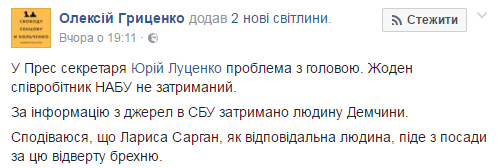 Ему вторит и Алексей Гриценко, заявляя о "проблемах с головой" у Сарган. Общая линия "защитников" НАБУ сводится к тому, что за распространенную недостоверную и неполную информацию пресс-секретарь ГПУ должна понести ответственность. Вплоть до того, что покинуть занимаемую должность.