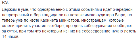 "Держим в уме, что одновременно с этими событиями идет очередной непрозрачный отбор кандидатов на независимого аудитора Бюро, но теперь уже по квоте Кабинета министров. Иностранцам, которые хотели принять участие в отборе, про день собеседования сообщают за сутки, при том что некоторым из них на собеседование нужно лететь 14 часов", - резюмирует Романюков в своем Facebook.