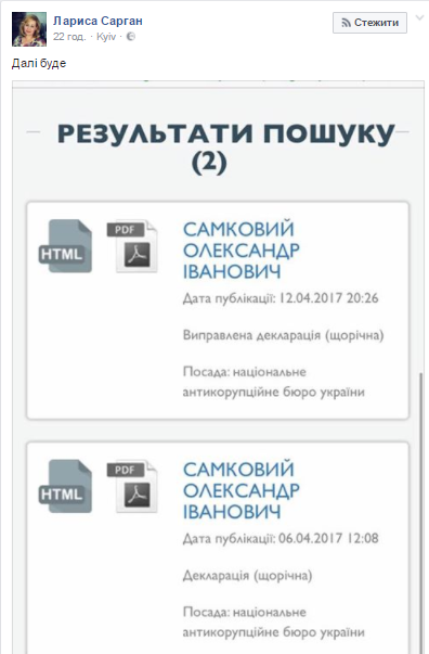 Это и повлекло за собой предмет дискуссии между комментаторами-интерпретаторами коррупционного скандала. Факт - если Самковой действительно уволен, то на данный момент должен был подать как минимум 2 различные декларации. Но не сделал этого.