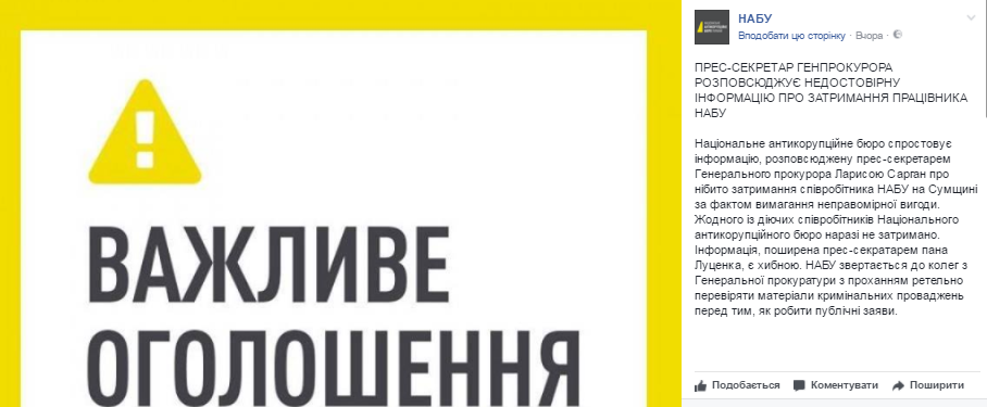 Официально в прокуратуре и СБУ не было обнародовано никаких комментариев по поводу случившегося. Вся информация от ГПУ продуцируется на странице пресс-секретаря Луценко Ларисы Сарган, но это, конечно же, не является ее личной инициативой.
