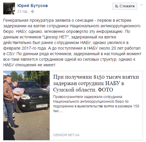 Журналист Юрий Бутусов подтверждает эту версию. Со ссылкой на источник в силовых кругах он пишет, что Самковой уволился из НАБУ перед началом весны, и в настоящее время является сотрудником одной из силовых структур, которая не имеет отношения к Антикоррупционному Бюро. При этом, за плечами у задержанного - почти 20 лет стажа в системе СБУ.