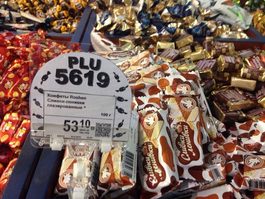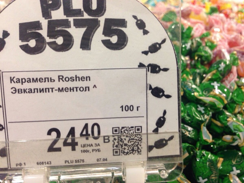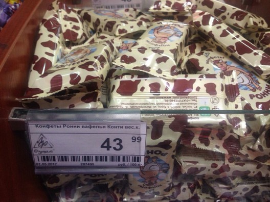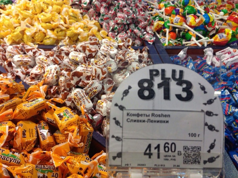 На фото видно известные названия конфет "Рошен" и цены в российских рублях.
