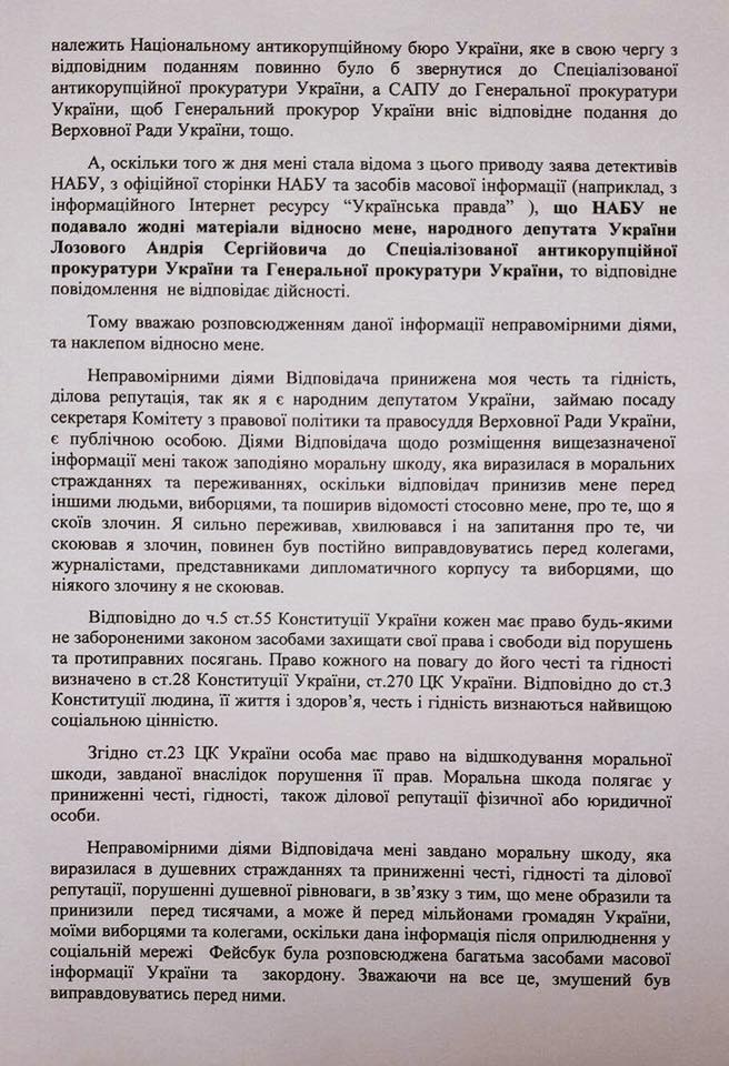 "Подал в суд на генерального прокурора Украины Юрия Луценко за распространение ложной информации против меня, что нанесло вред моей деловой репутации. Пытаясь дискредитировать Радикальную партию Олега Ляшко и запугать нас, генпрокурор без высшего юридического образования сделал заявление, в котором обвиняет меня в совершении преступлений, расследование которых даже не является компетенцией ГПУ", - написал Лозовой.