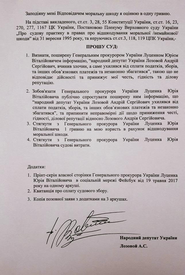Народный депутат Украины (фракция Радикальной партии Олега Ляшко) Андрей Лозовой сообщил, что подал в суд исковое заявление к генпрокурору Украины Юрию Луценко о защите чести, достоинства и деловой репутации. Об этом Лозовой написал на своей странице в Facebook.