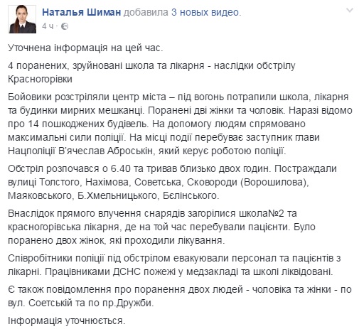 Представитель ГУ Национальной полиции Донецкой области Наталья Шиман уточнила, что атака боевиков "ДНР" на город началась с утра, примерно в 06:40. Боевики попали в больницу, где в это время были пациенты.