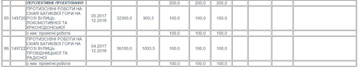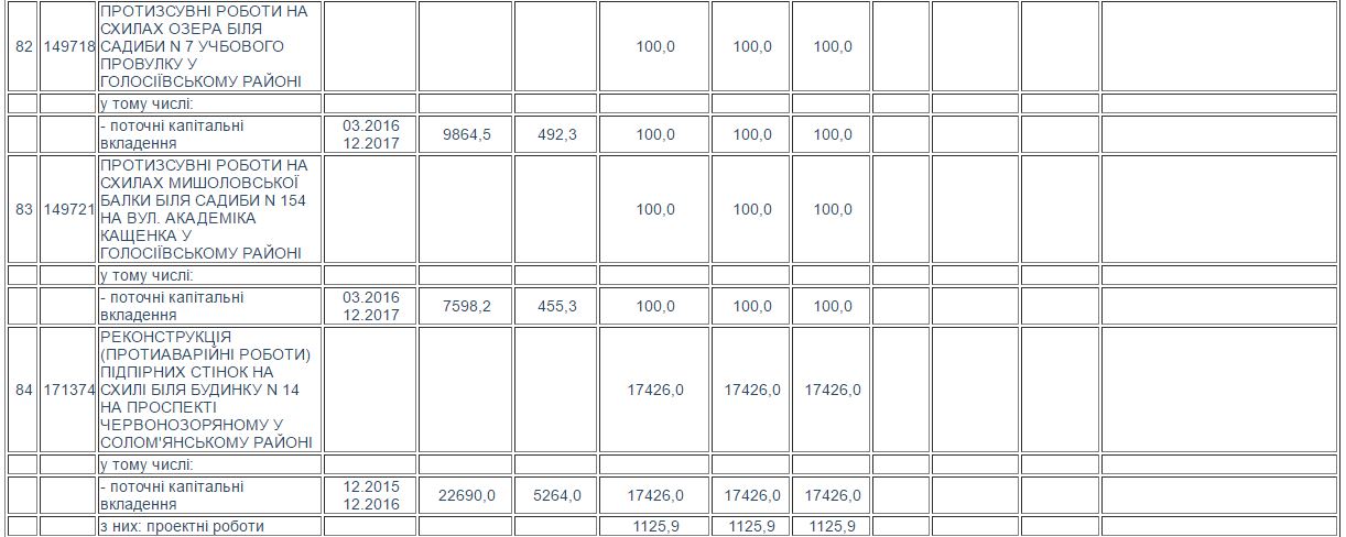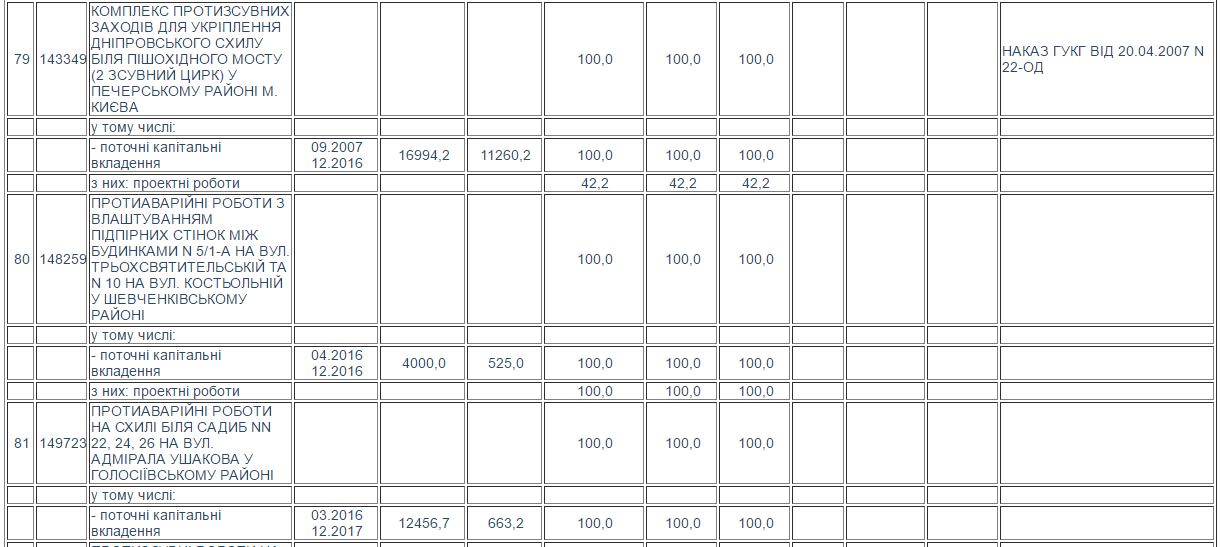 Згідно з Програмою, «Київбудреконструкція» мала за 30 000,0 тис. грн. знайти підрядника, щоб той провів протизсувні роботи на схилі озера Глинки в районі провулку Академіка Філатова у Печерському районі столиці. За ці гроші підрядник -ТОВ «Ягуар» - до кінця 2017 року має вирубати зелені насадження та знести нинішні укріплення, а потім влаштувати підпірні стінки, випуски, технологічний проїзд, дощову каналізацію, насосну станцію, огорожу та газони.