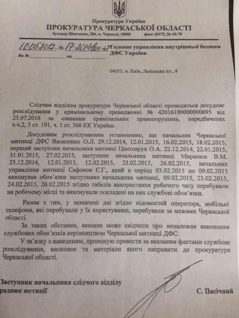 Согласно выводам следователя, в период 2014-2015 гг., когда все участники группы числились работниками Черкасской таможни, никто из них, согласно данным мобильных операторов, на территории области на самом деле не находился. То есть, зарплата начислялась, а работа не делалась. Однако этим обвинения в сторону Василенко и его товарищей не исчерпываются. Ведь поскольку на свои нынешние высокие должности в ГФС они были назначены уже в период открытых против них криминальных дел, то назначения эти незаконны. И могут быть аннулированы в любой момент.